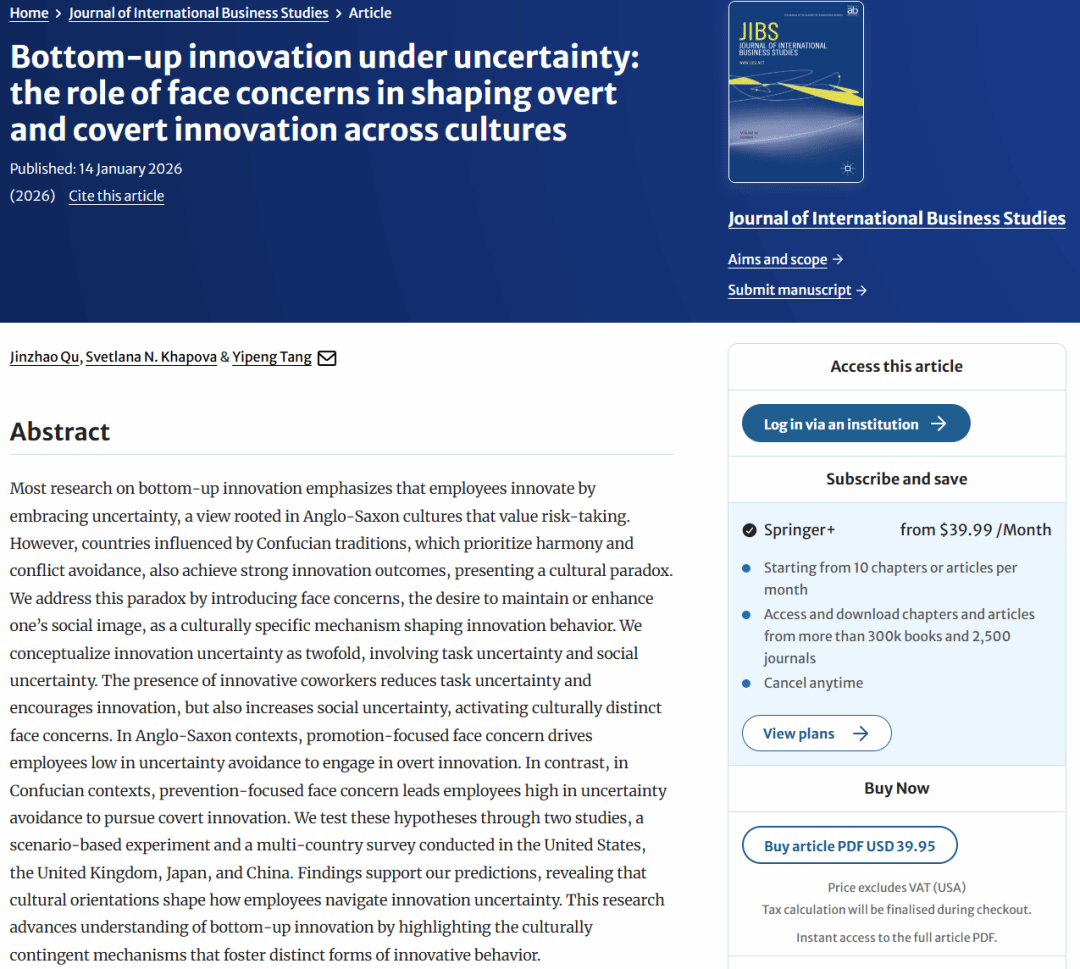 屈金照副教授作为第一作者,与阿姆斯特丹自由大学(Vrije Universiteit Amsterdam)Svetlana N. Khapova教授和中南财经政法大学汤一鹏副教授合作完成学术论文“Bottom-up innovation under uncertainty: the role of face concerns in shaping overt and covert innovation across cultures”在管理学领域国际顶级期刊Journal of International Business Studies正式在线发表。该期刊为UTD24期刊之一,是国际商科协会(Academy of International Business;AIB)的旗舰刊物,是国际商科公认的最高水平期刊,隶属av影片直播