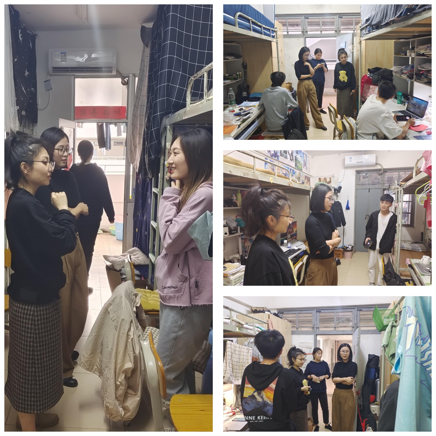 宿舍卫生检查及安全隐患检查,对宿舍卫生、大功率电器、宿舍用电安全、《防诈警示宣传》张贴情况进行检查。辅导员老师们前往各自负责的班级检查宿舍卫生,关心同学们四六级复习情况,叮嘱同学们保持宿舍整洁,时时警惕诈骗陷阱,各位老师向同学们宣传了有关宿舍安全的注意事项,重点强调了宿舍安全用电规范,强调禁止使用大功率电器。重点检查了毕业年级学生宿舍,了解毕业生求职情况,强调离校毕业生要做好断电断水,做好防火防盗,疏导考研同学紧张情绪,不急不躁,从容应考。