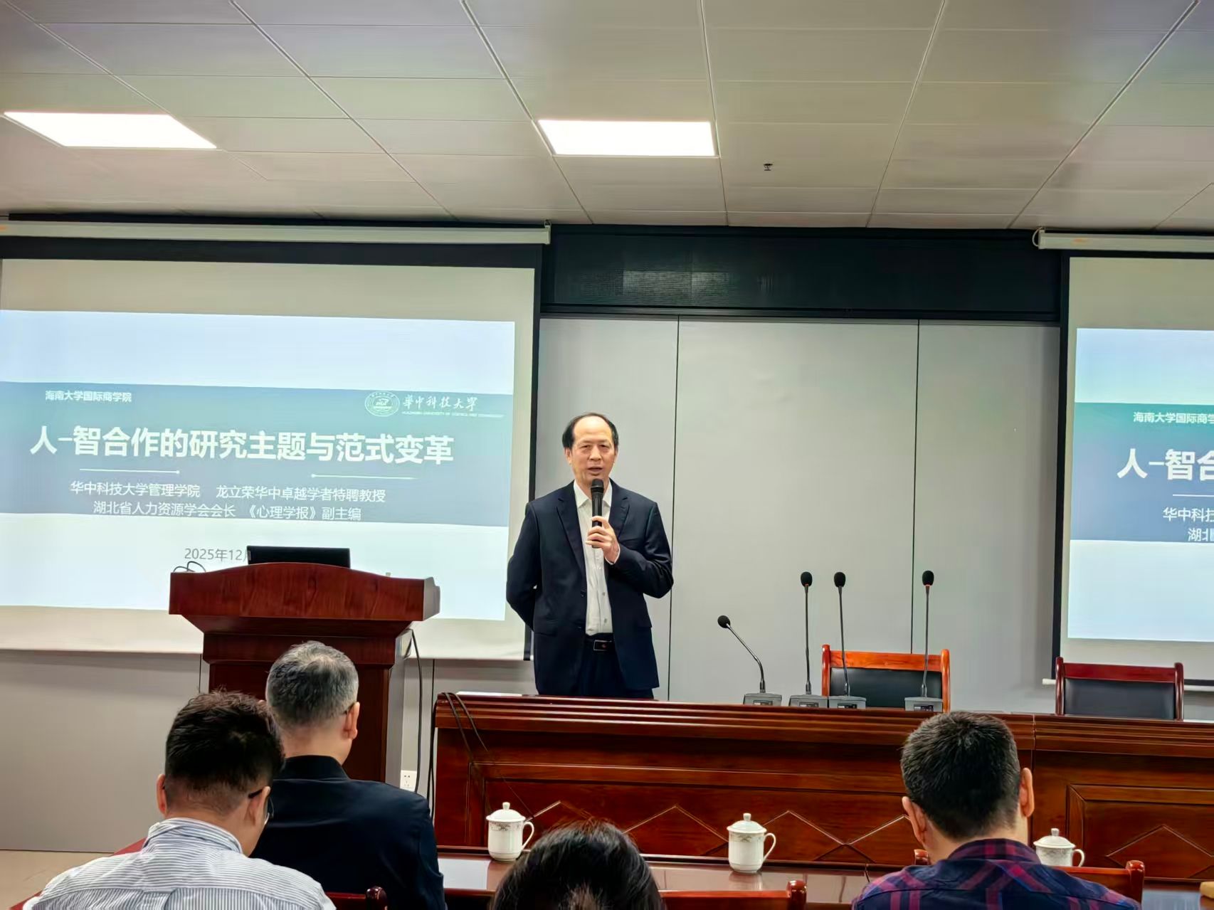 张克中教授对龙立荣教授的学术背景与研究贡献作了简要介绍,他指出,龙教授长期深耕组织行为与人力资源管理研究前沿,在相关领域取得了一系列具有影响力的成果,对推动管理学研究与实践创新发挥了重要作用。
